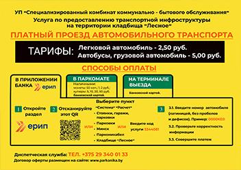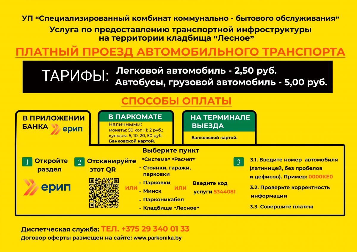 На территории кладбища «Лесное» плата за проезд взимается с владельца транспортного средства ( с лица, управляющего транспортным средством на основании любого полномочия) непосредственно перед выездом с территории места погребения с использованием оборудования автоматизированной системы учета транспортных средств и взимания оплаты. Оплата производится через терминалы в соответствии с техническими возможностями указанного оборудования (наличными денежными средствами, банковскими картами бесконтактным способом, с примtнением NFC-технологий и т.п.)
